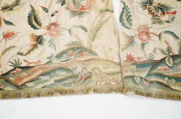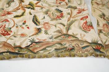 2)152cm wide x 394cm long (305cm crewel panel, 4cm red band, 85cm cream top) Condition - stained in places, small rust stains, fold marks.