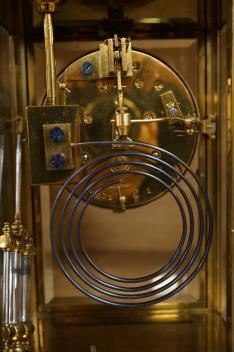 Lot 413 , A four glass and brass mantel clock, 25cm high, 17cm wide.