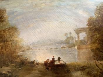 Lot 794 , Manner of JMW Turner RA (1775-1851), Italianate lakeside view, ink inscription verso, inscribed JMW Turner, unsigned oil on board, 17 x 24.5cm
