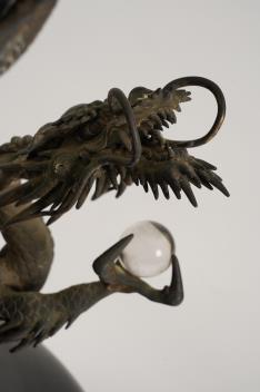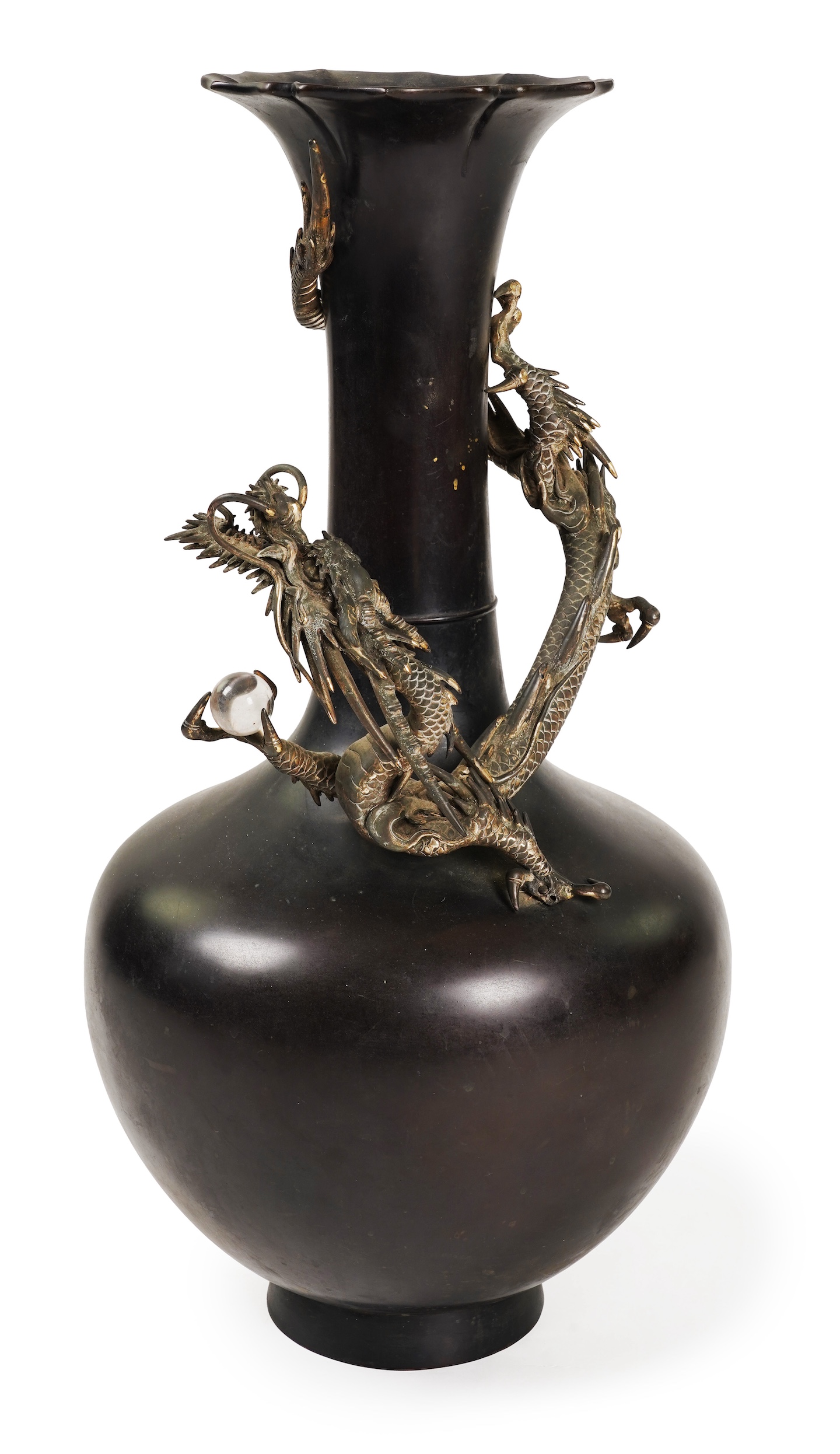 A massive Japanese bronze ‘dragon’ bottle vase, Meiji period, the long neck with petal lobed flared rim, encircled by a dragon with silvered highlights, clasping a glass ‘jewel’ in one paw, cast four character seal mark to base, 65.5 cm high, one claw missing