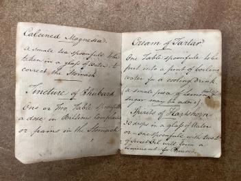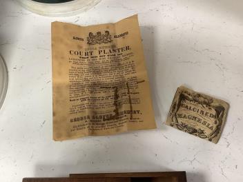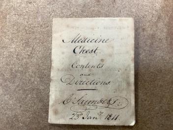 In generally good condition, with minor wear, some scorch marks to the tops of the doors, and a few missing items. Cast metal funnel see images 10 and 11. Also includes full graduated set of Guinea weights, image 12. And interesting hand-written list of contents, dated 1811, images 13, 14 and 15. Calcined Magnesia label see 16th image, as noted in the hand-written list, 1811.
