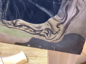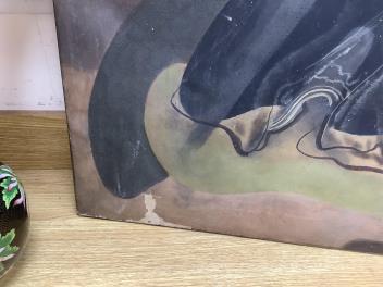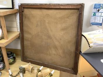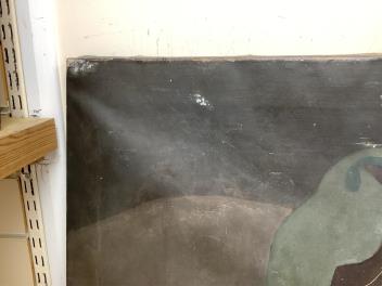 Canvas a little rippled; oil losses to lower area and corners; several white paint specks; other rubs, dirty.