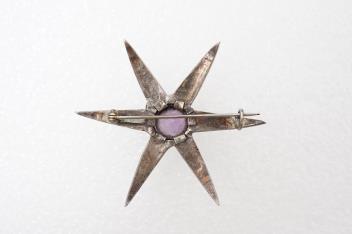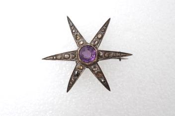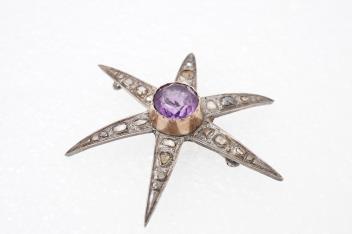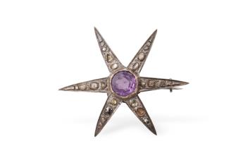 Lot 2902 , An amethyst and diamond brooch, designed as a star, set with a circular-cut amethyst and rose-cut diamonds, mounted in silver and gold, length 5.7cm, two diamonds deficient