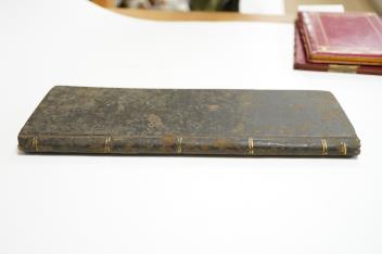 Few leaves creased at front, edges frayed and some marginal worm, text scored and marked throughout, cloth marked and discoloured, archive paper repairs final leaves. Some ink kicks/annotations towards end on 5 leaves, earlier is pencil