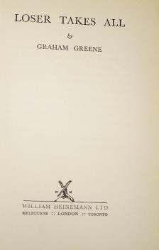 ° Greene, Graham - Loser Takes All. first edition. half title; publisher's gilt cloth and d/wrapper. William Heinemann, 1955. *the writer Richard Whittington - Egan's copy, his ink ownership on front free e/p. - Richard Whittington - Egan / Sheffield / xx ii /vii
