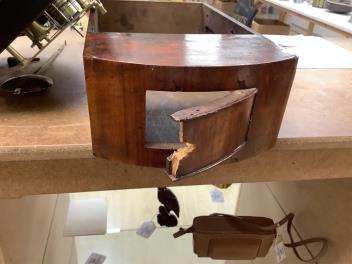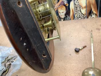 Case is walnut and burr walnut; bezel hinge secured by replacement screws; sheet brass bezel, not cast; underside door chipped and incomplete; dial good; with pendulum but no key. Has been wound and set going, kept good time over some eight hours, although not guaranteed.