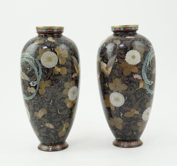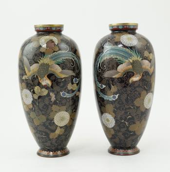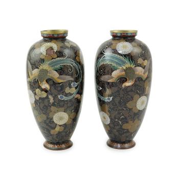 Lot 53 , A pair of Japanese cloisonné enamel ‘phoenix’ vases, by Gonda Hirosuke I, Meiji period