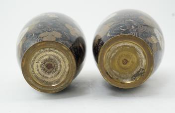 A pair of Japanese cloisonné enamel ‘phoenix’ vases, by Gonda Hirosuke I, Meiji period, each decorated in polychrome enamels and fine silver wire with phoenixes amid chrysanthemums amid scrolling foliage, on a black ground, bronze rims, stamped with the flaming tama logo to the base, 24.5cm high, enamel loss to one shoulder