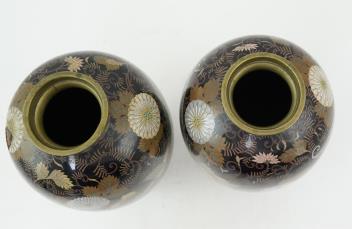 One of the vases has a enamel loss and dent to a chrysanthemum on the shoulder and some occasional small tiny pits to the enamel all over. There is evidence that both of the vases once had silver plating to the rims and base now worn off.