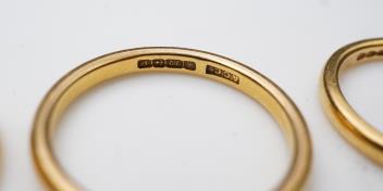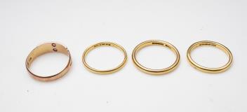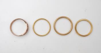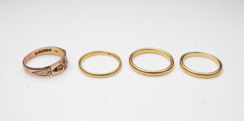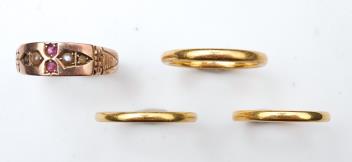 A collection of four gold rings, comprising: three wedding bands in 22ct gold, sizes L1/2, O and O1/2 respectively, each with British hallmarks, combined gross weight approximately 8.5 grams; and a ruby and split pearl ring in 9ct gold, size O, British hallmarks, date for 1903, pearls untested, gross weight approximately 2.5 grams