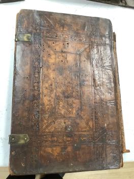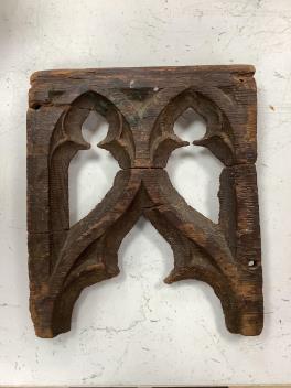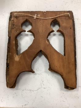 Book-binding leather worn, rear side with worm-holes, some of which are quite large, circa 1700 or earlier. Parchemin panel glue-repaired vertically; with evidence of old woodworm, hole at top for hanging, two corners chipped, the panel itself incomplete, circa mid-16th century. Gothic tracery panel glue-repaired and strengthened with ply at rear, holed twice for hanging, old woodworm, circa 1550 or earlier. Kneeling faun corbel good, 17th century.