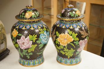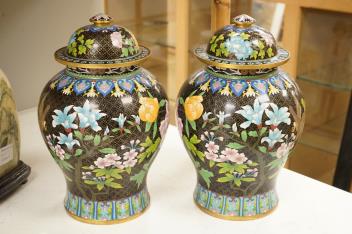 Lot 1354 , A pair of Chinese cloisonné baluster jars and covers decorated with birds and flowers, 38cm high