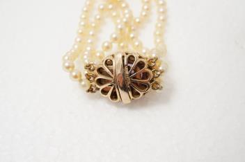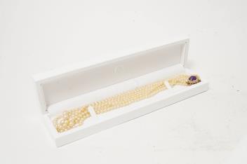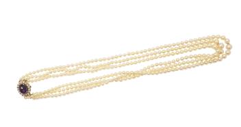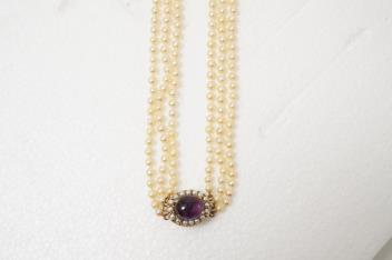 An amethyst and cultured pearl necklace, the three-strand necklace composed of graduated cultured pearls measuring approximately 3.5-7.7cm, to a 9ct gold clasp set with a cabochon amethyst within a border of split seed pearls, length approximately 47.5cm, British hallmarks
