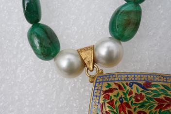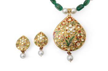 An emerald, ruby, enamel, cultured pearl and diamond demi-parure, India, comprising: a necklace, composed of emerald and glass-filled ruby beads, spaced by cultured pearls, suspending a pear-shaped gold-cased pendant applied with multicoloured enamels in floral designs, accented by polki diamonds in foiled settings, the reverse enamelled with a man riding an elephant hunting a tiger, necklace length 37cm, pendant length 10cm including bail; together with a pair of earrings of similar design, length approximately 4.8cm each, clip and post fittings