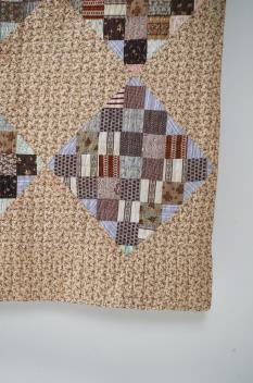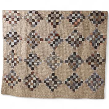 Lot 360 , An American Kentucky 1865 (Civil War) block strip, ‘postage stamp’ hand quilted bedcover. Made from a large selection of highly fashionable madder dyed printed cottons of the day, as large concentric diamond shaped strip