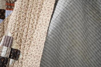 An American Kentucky 1865 (Civil War) block strip, ‘postage stamp’ hand quilted bedcover. Made from a large selection of highly fashionable madder dyed printed cottons of the day, as large concentric diamond shaped stripes. Backed with an ornate striped ticking style cotton. 224cm x 196cm. Condition - the colours and cottons are strong with no fading, there is some light discolouring on the back. The quilt is overall in good condition and appears to have been hardly used or washed.