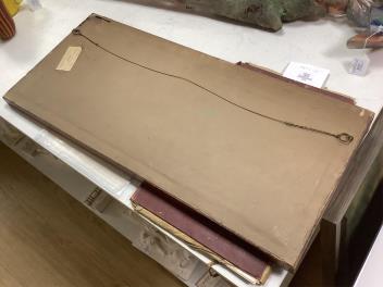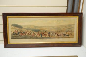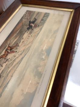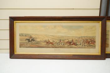 Rosewood frames probably original; Full Cry with horizontal corrosion, image 9; Breaking Cover with three spots, image 10. Storage labels verso, 1966. Frames 38 x 86.5cm. The plates 21 x 71cm.