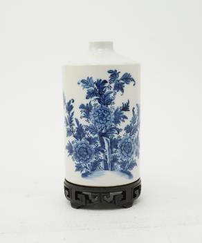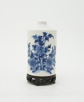 An unusual shape Chinese blue and white vase, 18th/19th century, painted with flowers, berries and rockwork, 15cm high, wood stand