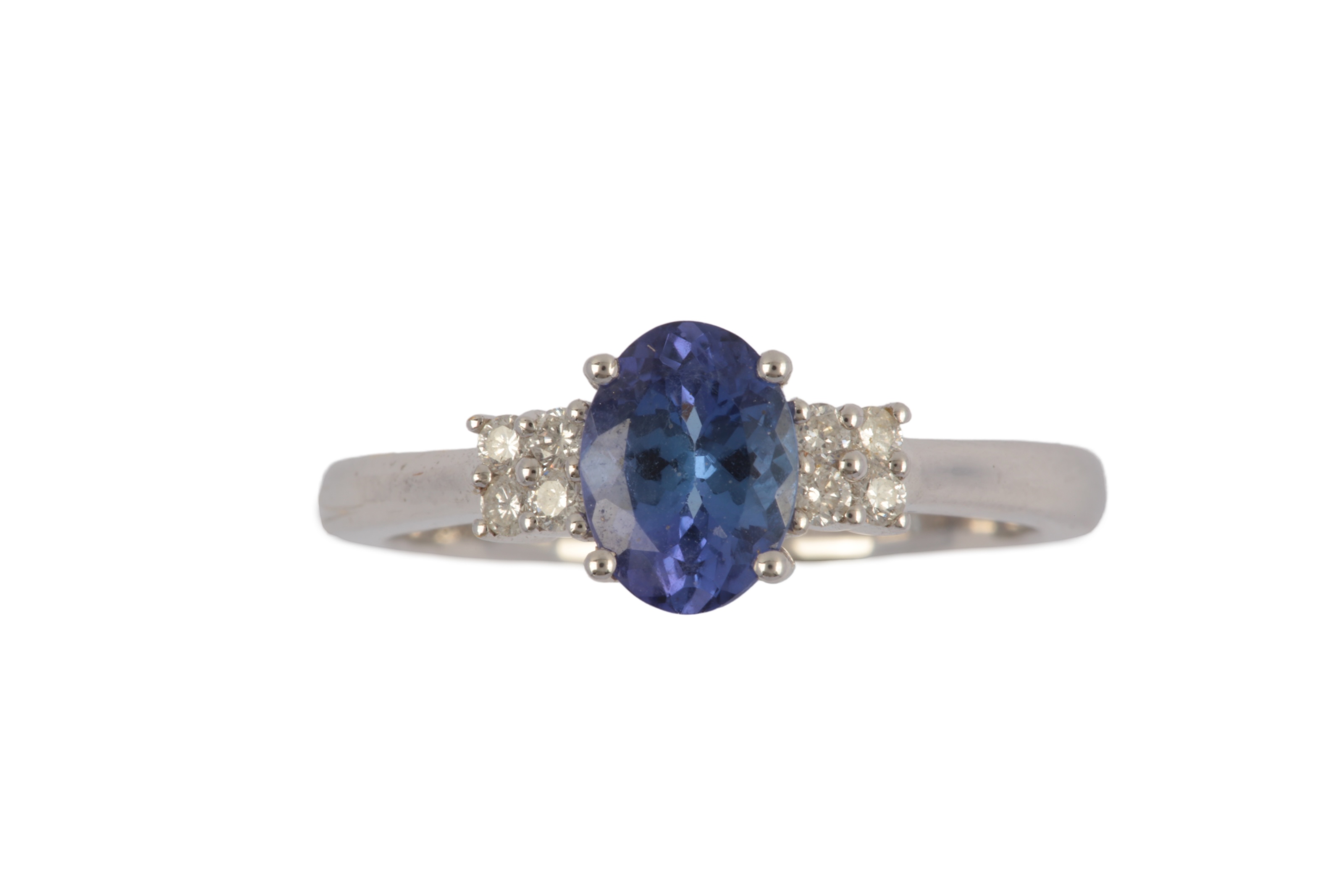 A tanzanite and diamond ring, claw-set with an oval tanzanite weighing approximately 0.90 carats, to shoulders set with brilliant-cut diamonds totalling approximately 0.10 carats, mounted in 18ct white gold, size N1/2, gross weight approximately 4 grams