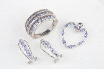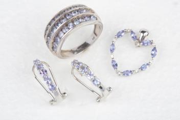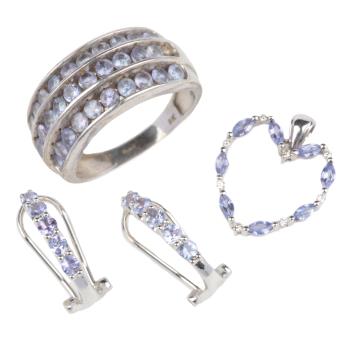 A collection of tanzanite jewels, comprising: a pair of half hoop earrings set with circular-cut tanzanites in white gold, length 1.8cm each, stamped 18K, combined gross weight approximately 5 grams; a heart-shaped pendant set with marquise-shaped tanzanites and brilliant-cut diamonds in 18ct gold, length 2.1cm, British hallmarks, gross weight approximately 1.5 grams; and a half-hoop ring channel-set with three rows of circular-cut tanzanites, in 9ct white gold, size N1/2, British hallmarks, gross weight approximately 4.9 grams, one tanzanite deficient