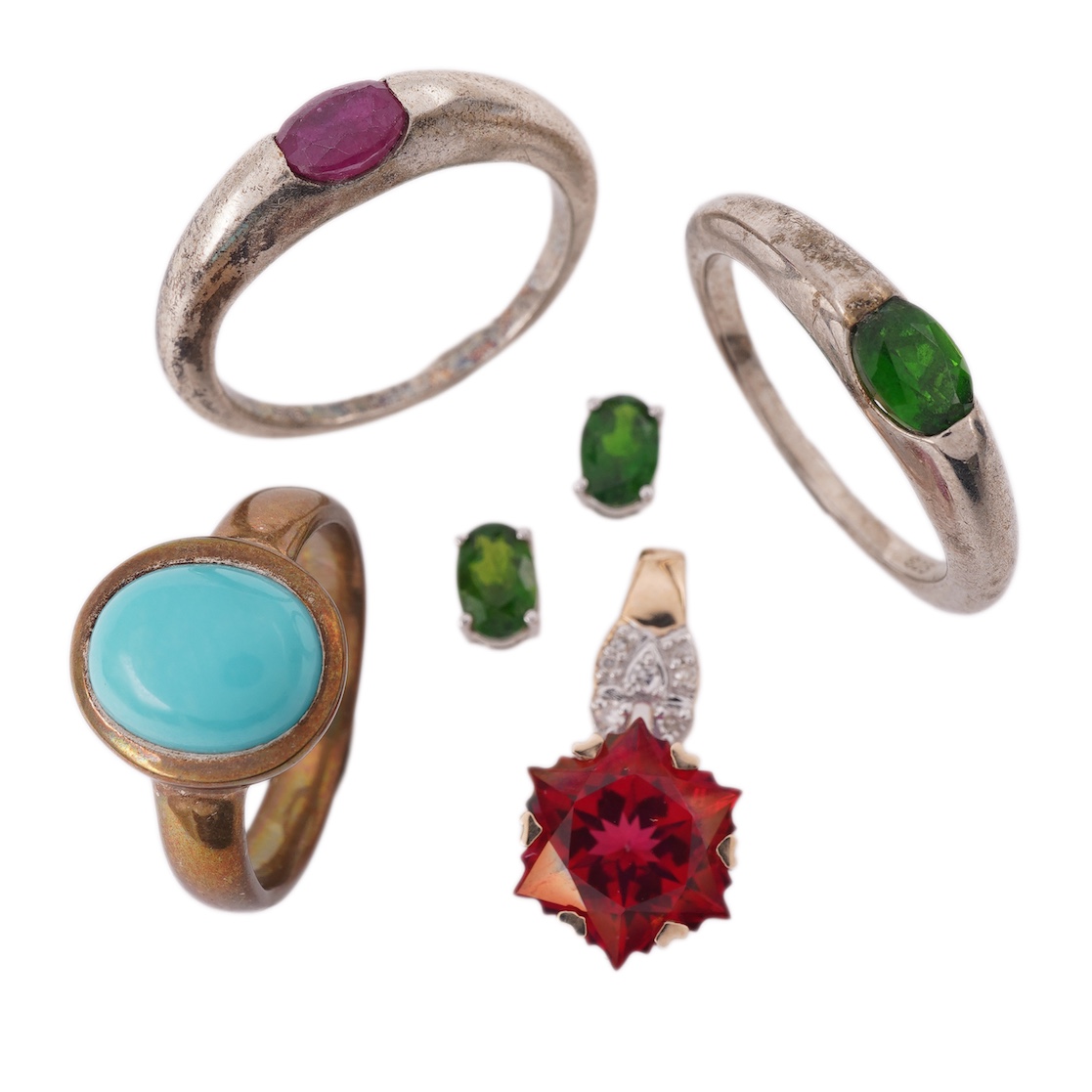 A collection of jewels, comprising: a ring and pair of studs, each set with oval peridots, the ring size P, stamped 925; the earrings 0.6cm each, stamped 9K; a similar ring set with an oval ruby, size P, stamped 925; a diamond and synthetic red gemstone pendant in 9ct gold, length 2cm, British hallmark, gross weight approximately 2.4 grams; and a turquoise cabochon ring mounted in silver, size K1/2