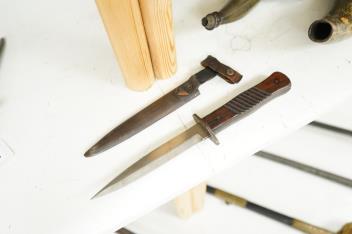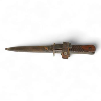 In good condition with some age wear. Walnut grip with old split close to cross-guard, image 7; scabbard fit for purpose; leather softened with acceptable wear, button-clasp good and tight.