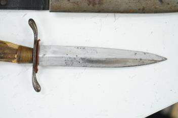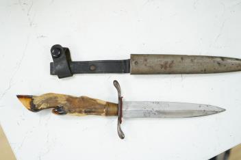 Lot 1291 , A First World War German Deer Hoof Fighting Knife, with a deer’s hoof grip, brass ferrell and steel cross guard, in original steel scabbard with leather belt loop mount, single edged blade with makers mark to one side; M