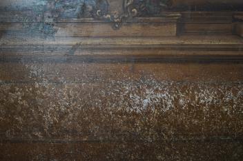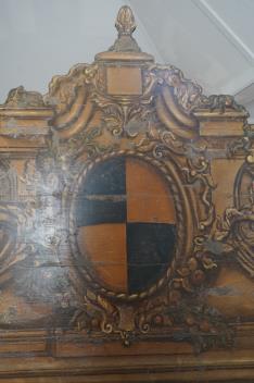 A pair of European painted pine courtyard panels decorated with scrollwork oval armorials, 194cm wide, 212cm high