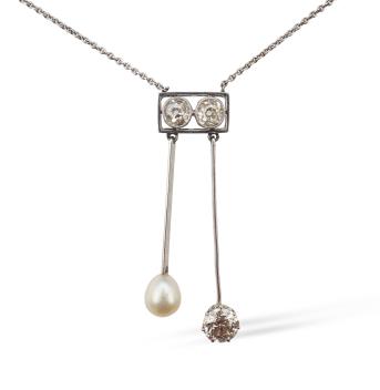 An Art Deco pearl and diamond negligée pendant, 1920s, centring on a pair of cushion-shaped diamonds totalling approximately 0.40 carats within a rectangular knife wire frame, suspending two pendants of asymmetrical lengths, culminating in a pearl measuring approximately 5.7 x 5.7 x 6.9mm, and a circular-cut diamond weighing approximately 0.65 carats, to a fine chain necklace, chain length 42cm, pendant length 3.9cm, pearl untested
