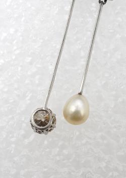 Attractive and in good condition - white precious metal is unmarked, likely platinum or white gold, knifewire could also be gold and silver with rhodium plating - not tested and not possible to guarantee which, but not base metal. Diamonds bright and attractive older cuts, largest estimated as SI2/I1 clarity (some inclusions under table, not particularly obvious to naked eye. Overall a very stylish design in good condition, gross weight 6 grams. Pearl untested, in good condition.