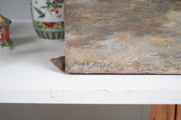 Lot 1706 , Hugh Allan (Scottish, 1862-1909), Study of a woman and chickens before cottages, signed, oil on canvas, unframed, 46 x 35cm