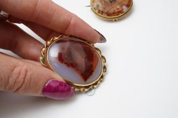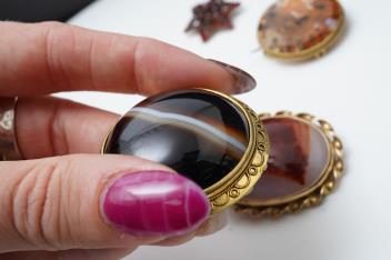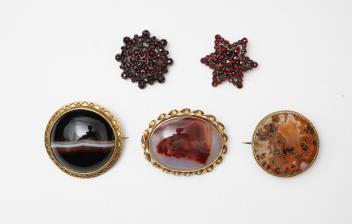 A collection of five brooches, 19th century, comprising: three brooches, set with cabochons of onyx and jasper, within gilt metal borders, longest 4cm; and two garnet cluster brooches, longest 2.9cm