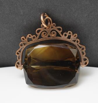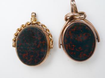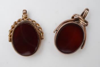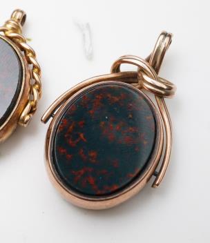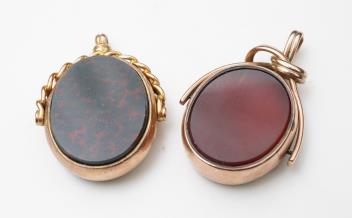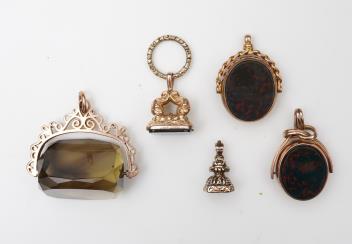 A collection of fob seals comprising: two swivel fob seals set with oval panels of carnelian and bloodstone, a seal set with a rotating faceted smoky quartz, and a bloodstone pendant fob seal of foliate design, each mounted in 9ct gold, tallest 3.8cm including bail, each with British hallmarks, combined gross weight approximately 43 grams; and a small fob seal set with banded onyx, gross weight 2 grams