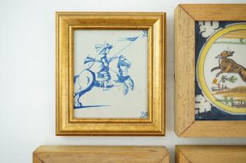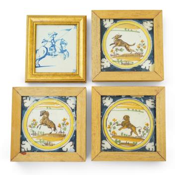 Lot 52 , Three Spanish polychrome maiolica ‘animal’ tiles, Triana, early 18th century and a Delft blue and white tile, 19th century
