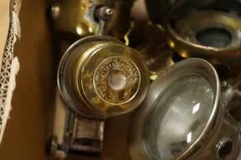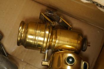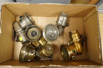 Lot 370 , An early 20th century Lucas ‘King of the Road’ brass carriage lamp, 35cm high, together with five brass motorcycle lamps by Lucas, etc.