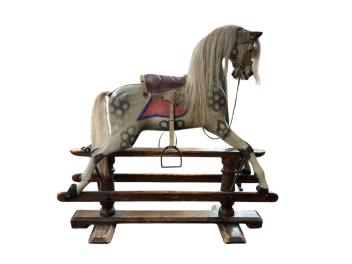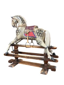 Lot 411 , An Ayres type dappled grey painted rocking horse, pine base and runners with good patination and applied brass roundels to both the base and the horse celebrating Queen Victoria‘s Golden Jubilee in 1887, the horse has be