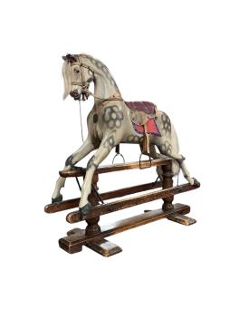 An Ayres type dappled grey painted rocking horse, pine base and runners with good patination and applied brass roundels to both the base and the horse celebrating Queen Victoria‘s Golden Jubilee in 1887, the horse has been restored and repainted, height to the top of the head 96cm, overall length 101cm