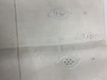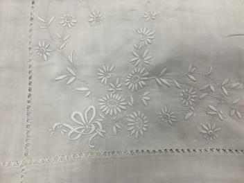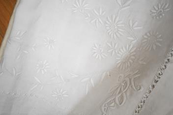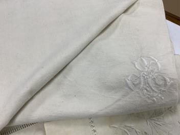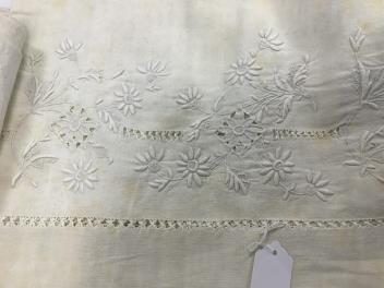 Lot 289 , Four 19th century French provincial linen top sheets. Two with deep heavily floral embroidered turn backs, another with tear drops embroidered on the turn back, the other a narrower sheet with a single embroidered monogr
