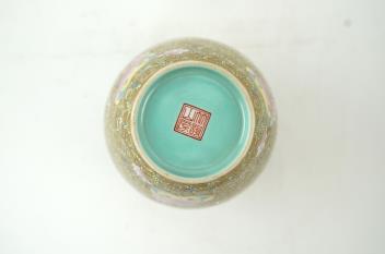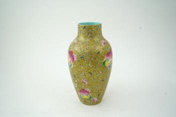 A Chinese famille rose ‘ six peach’ vase, probably early 20th century, painted with six peaches, flowers and foliage on a gilt ground, four character seal mark to base, 23cm high