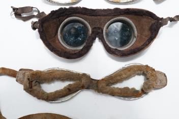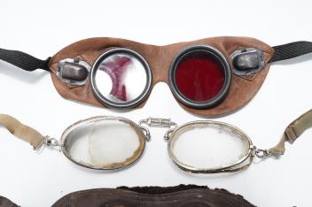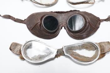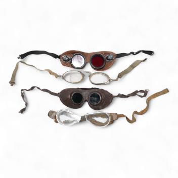 A pair of early aviation aluminium framed flying goggles, a pair of leather and felt lined goggles with green tinted lenses, a pair of French ? aviator flying goggles and a pair of WW2 First Pattern RAF Night Simulation Training Goggles, red lenses (4)