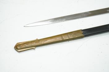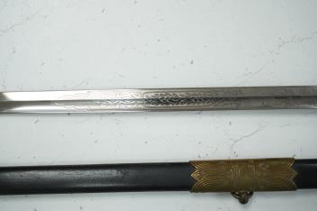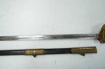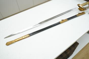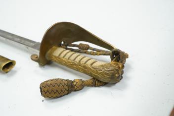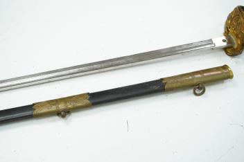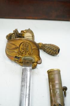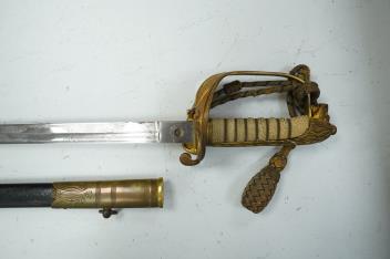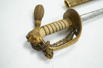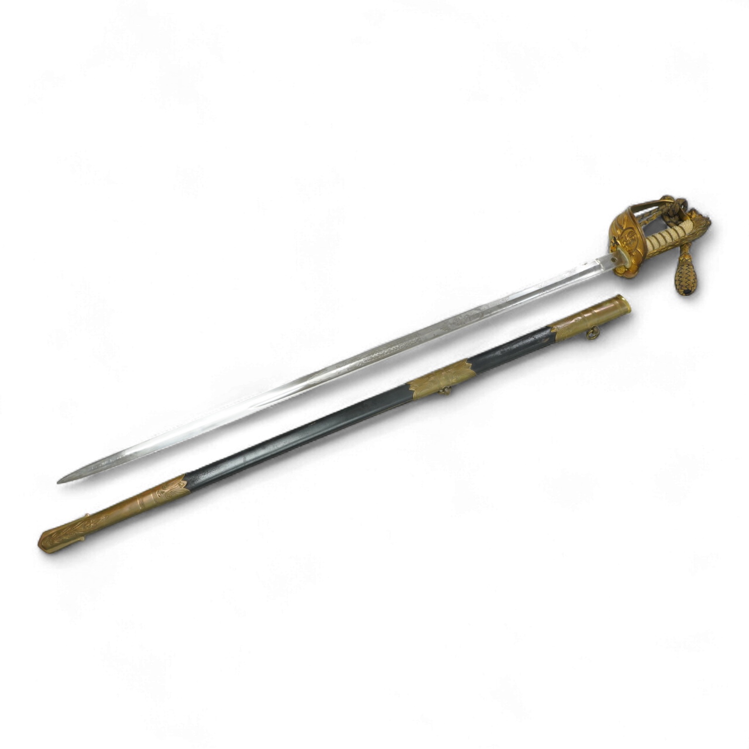 Lot 1271 , A George V regulation naval officer’s sword, the blade etched and polished, with regulation hilt with folding side guard engraved with owner‘s name R. Colville, bullion dress knot and in its brass mounted leather scabbar