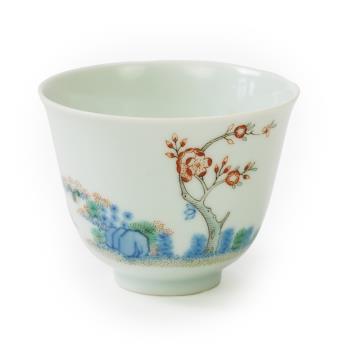 A Chinese inscribed wucai ‘month’ cup, Daoguang mark but later, painted with a prunus tree in a rock work garden, with four column inscription, six character seal mark to base, 5.3cm high