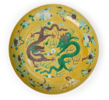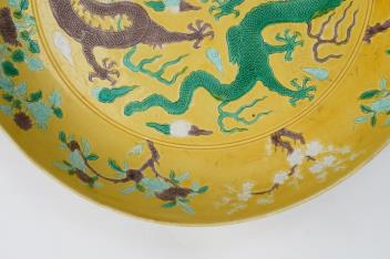 Lot 125 , A Chinese yellow, green and aubergine glazed and incised ‘dragon’ dish, chuxiugong zhi hall mark, possibly Guangxu period