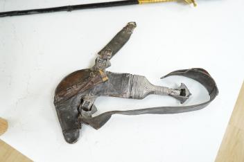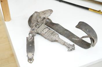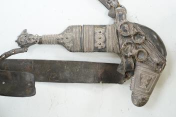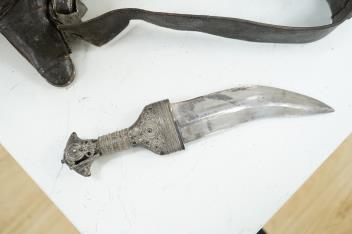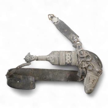 Lot 1285 , A late 19th century Arab silver mounted dagger jambya with silver filigree mounts to hilt and sheath, in its leather covered scabbard with parts of the original belt
