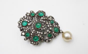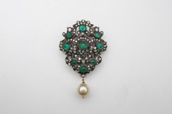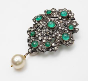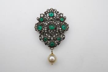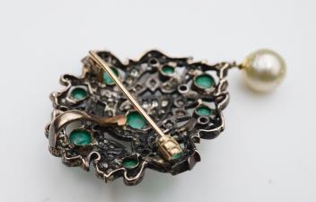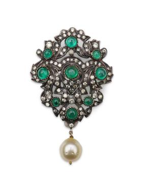 Lot 597 , An emerald, cultured pearl and diamond pendant/brooch