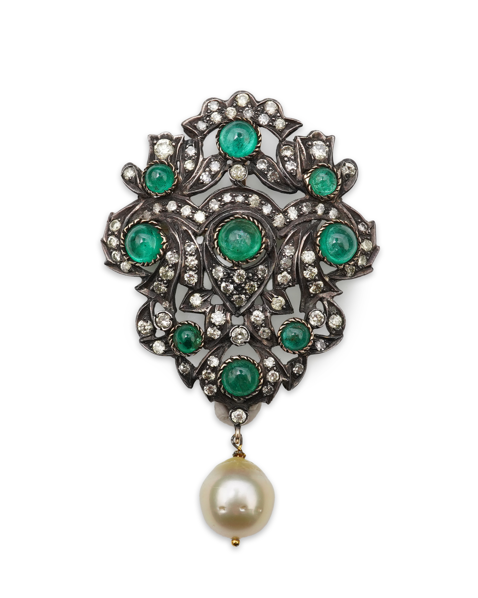 An emerald, cultured pearl and diamond pendant/brooch, designed as a panel of foliate scrollwork, set with cabochon emeralds and brilliant-cut diamonds, suspending a cultured pearl drop, mounted in silver, length 5.1cm