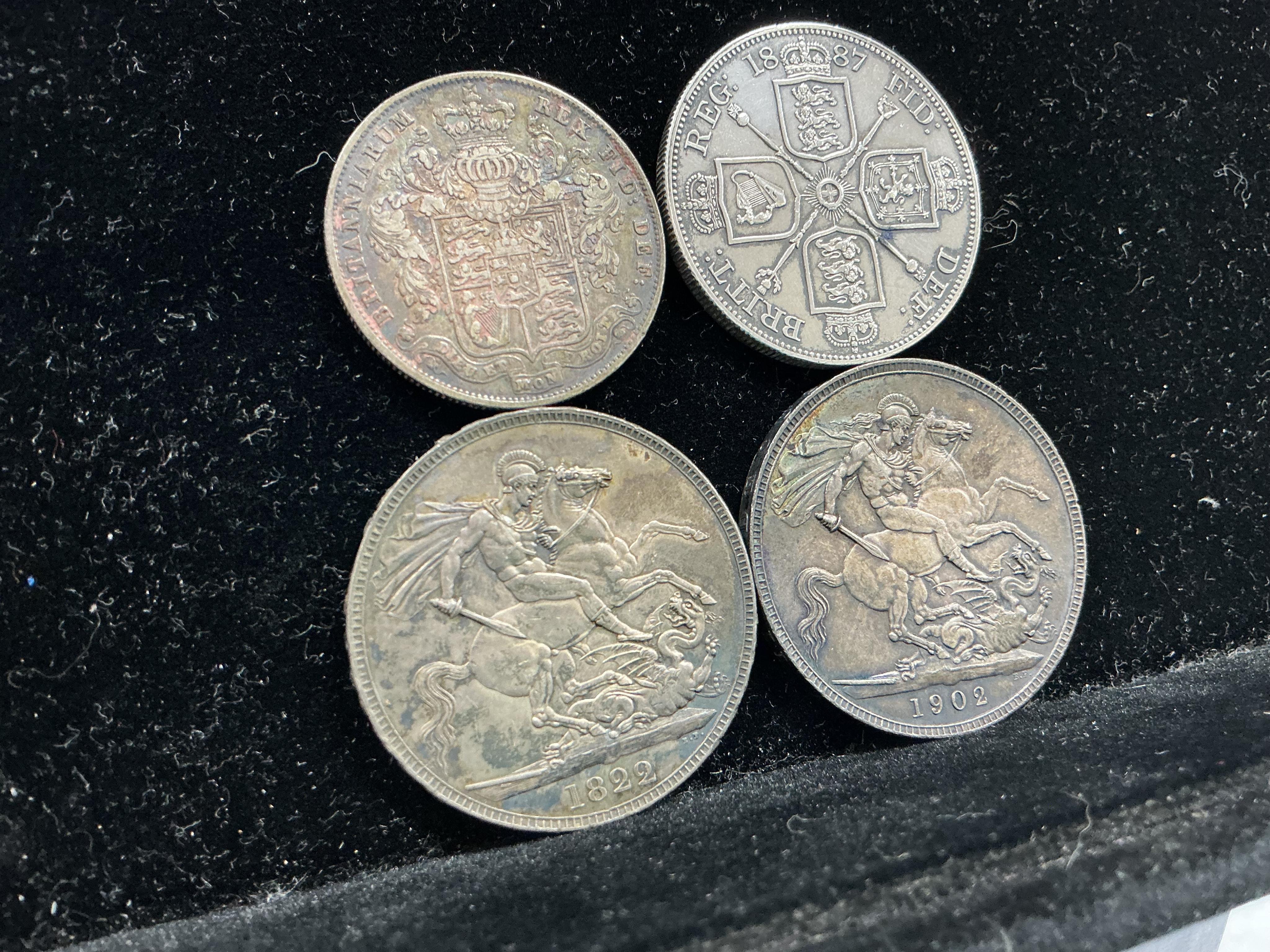 Lot 2011 , British coins, George IV to Elizabeth II, comprising, George IV, silver crown, 1822, edge TERTIO, S 3805, rim wear, otherwise EF, George IV, halfcrown, 1829, good fine, Victoria, double florin, 1887, cleaned otherwise go