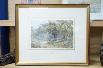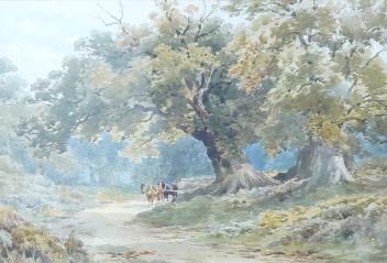 Lot 2724 , Alfred Powell (fl.1870-1901), 'The logging team', watercolour, unsigned, inscribed to the mount and Bourne Gallery label verso, 22 x 34cm