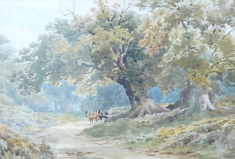 Alfred Powell (fl.1870-1901), 'The logging team', watercolour, unsigned, inscribed to the mount and Bourne Gallery label verso, 22 x 34cm