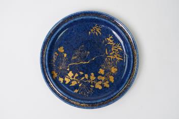 A Chinese gilt-decorated powder blue ‘fighting cricket’ box and cover, Xuande six character mark but later, the cover decorated with a bird perched on a branch, the box with calligraphic inscription and foliage, 13cm diameter